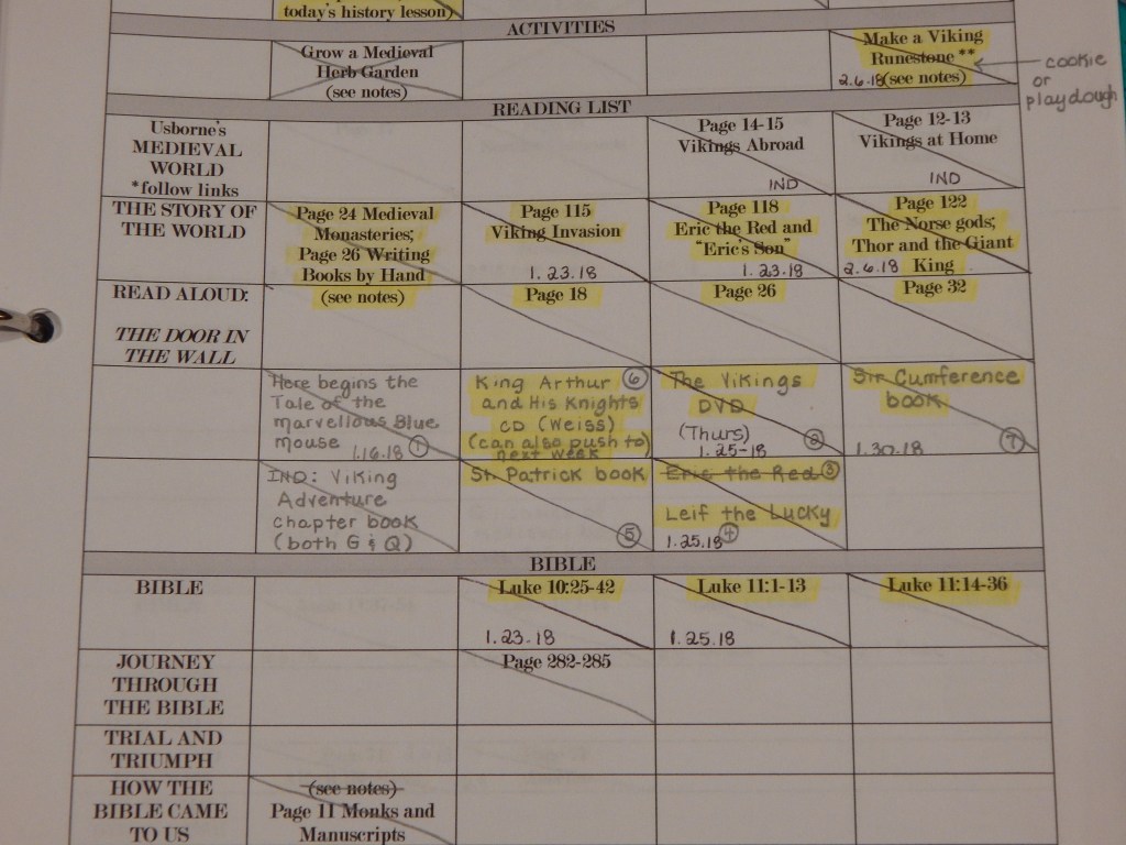 As explained in a prior post I prefer to REWRITE my MFW lesson plans. (Lingo break: MFW=My Father’s World. That original post can be accessed: HERE.) I get easily confused looking at grids with superfluous information, or grids organized by a system that doesn’t pertain to my life — such as a grid structured Monday through Friday…when we may be doing a Tuesday’s work on a Thursday. Or perhaps our light day is on a Wednesday and the grid offers lighter work on a Friday. Or it shows books/subjects/plans we will be substituting. I found myself opening the MFW Teacher’s Manual and trying to navigate to the pertinent information in a sea of stormy excess…with three pairs of eyes staring me down ready to start throwing paper airplanes at the first hint of a quiet motherly lull. It’s like my children know 15 seconds of mom staring confusedly at her TM = time to launch Operation Mayhem.