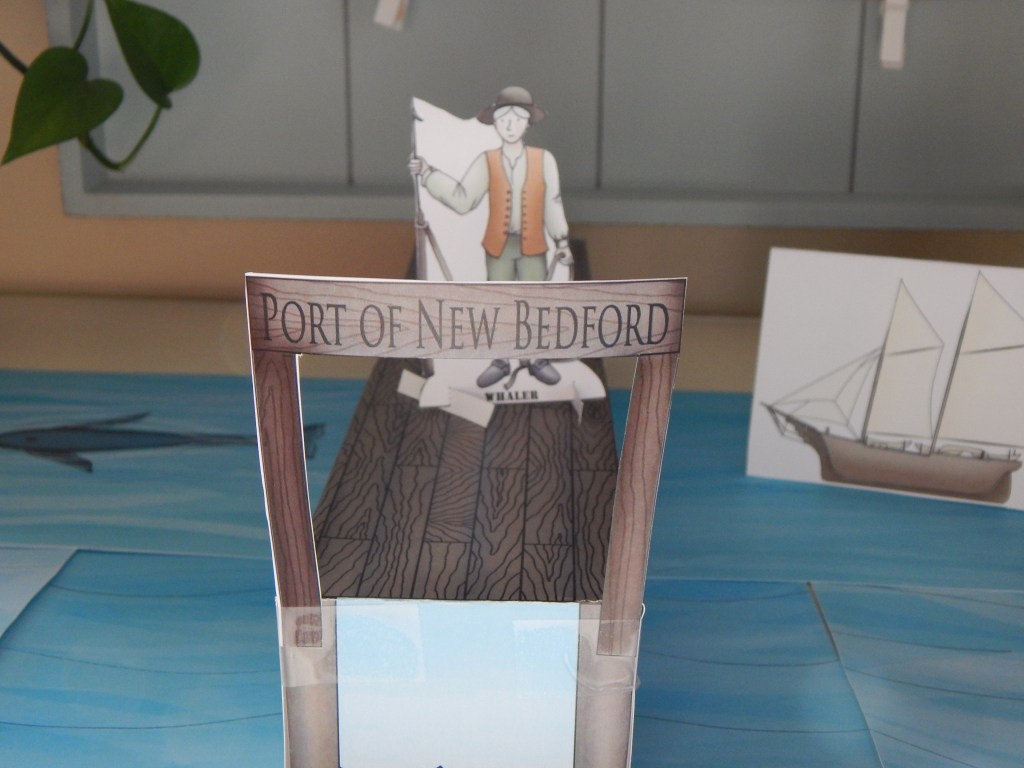 Week 3 of AS1 also launches the optional “Build the American Story” resource. This resource was probably the biggest selling feature for me, and I’ve been patiently waiting to dig into it with my kids! (I mention an economical method of printing it in a previous post, you can find that HERE.) Our first task was to build the port for the town of New Bedford. It comes with a long pier, a fisherman, a whaler, two small boats, a whaling ship, and ocean/shoreline background sheets showing a whale. This week we also built the New York Shipbuilder’s Shop, which is equally stunning — but was a bit of a learning curve!! I have a background in model building and am a whiz with an Xacto blade, but stumbled a bit through the wording of the WinterPromise directions. I plan to document our building process so that others who are interested in the “Build the American Story” resource can see what it’s like. As always–I’ll list the errors, tips, & tricks we come across at the end of each week’s post.